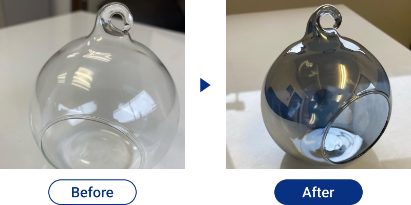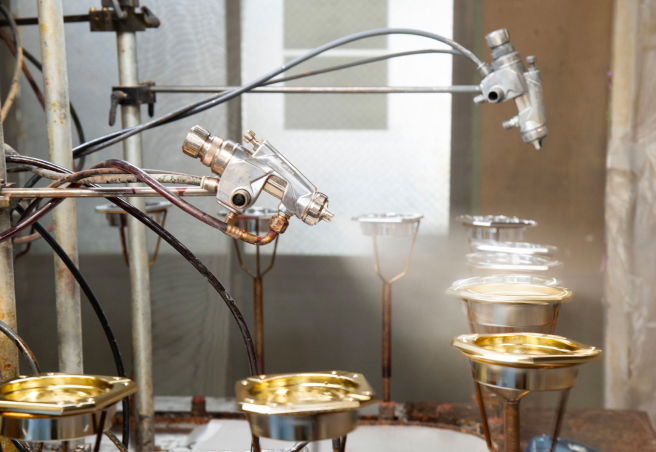 アンダーコートを施し、十分に乾燥させた製品は真空蒸着機によりアルミを蒸着させることで、鏡のような輝きを持っためっき加工が実現します。シルバーだけでなく、ゴールドやカラフルな色の蒸着にも対応可能です。