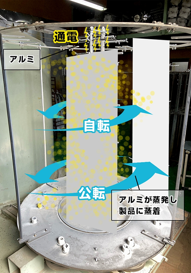写真のような機械に製品を治具で固定し、機械を真空状態にします。真空状態の内部でアルミを加熱・蒸発させ、発生した蒸気を回転させた製品に均一に付着させることで、継ぎ目のない美しいめっきが仕上がります。